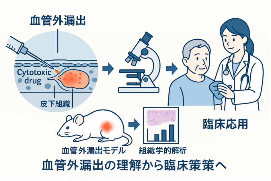 マウスモデルを用いて抗がん薬の血管外漏出時の局所反応や対処療法の影響を評価し、臨床現場での対処法や予防策の確立に取り組んでいます。